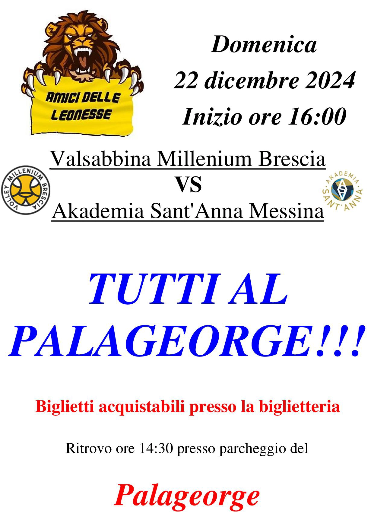 Gli amici delle leonesse ti aspettano al Palageorge di Montichiari per la partita casalinga Valsabbina Millenium Brescia – Akademia Sant’Anna Messina